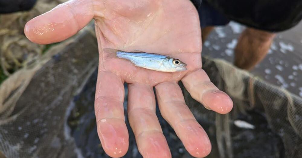A Maryland Department of Natural Resources surveyor holds a juvenile striped bass from the Nanticoke River. (Joe Zimmermann/Maryland DNR)