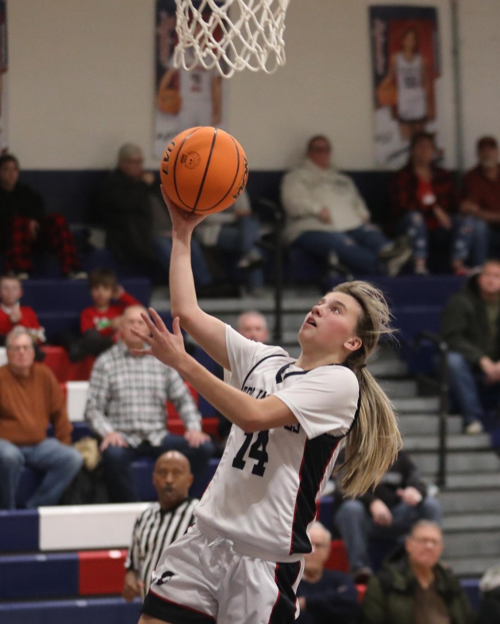 Greater Nanticoke Areas Navaeh Baran drives to the hoop guarded by Wyoming Seminarys Ellie Kersey during action Friday Night December 19th 2025 at Greater Nanticoke Area. DAVE SCHERBENCO / CONTRIBUTING PHOTOGRAPHER