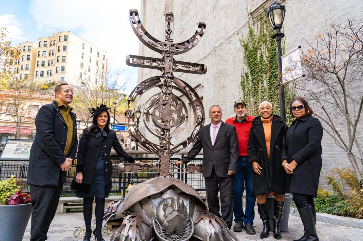 (Left to Right: Yonkers Parks, Recreation & Conservation Commissioner Steve Sansone; President Shannon Holsey, Stockbridge-Munsee Band of Mohican Indians; Mayor Mike Spano; Sculptor Al Wadzinski; Yonkers City Councilwoman Deana Norman; Yonkers City Councilwoman Tasha Diaz with the newly installed “Many Trails” sculpture at Daylighting II at 2 Mill Street. Photo Credit: Maurice Mercado/City of Yonkers